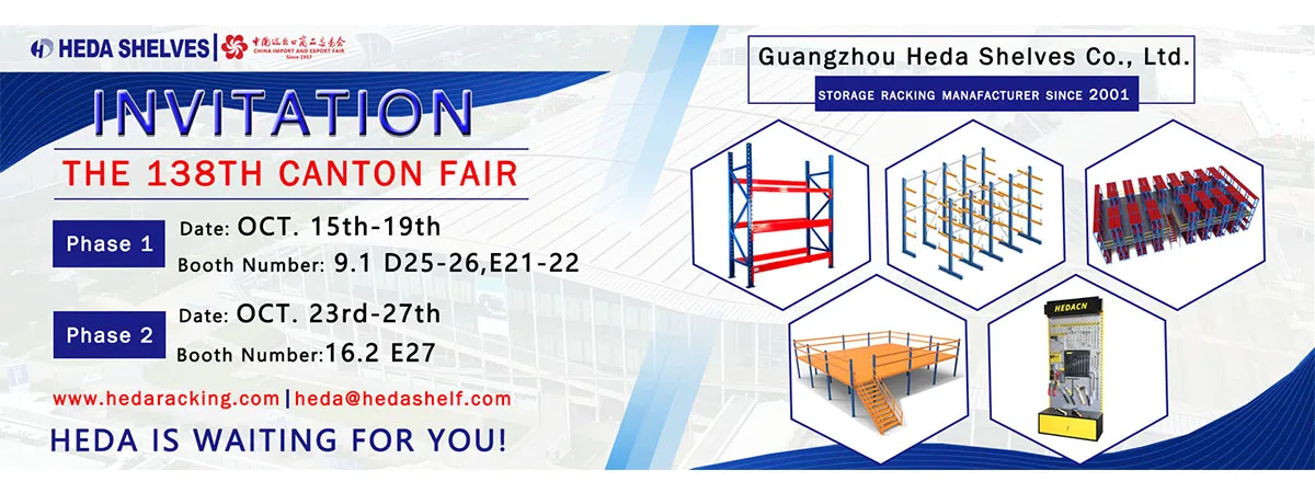 Guangzhou HEDA Shelves Co., Ltd was founded in 2001. We specialize in designing, manufacturing, selling and installing all types of warehouse storage racks, supermarket shelves and tool display stand, etc.